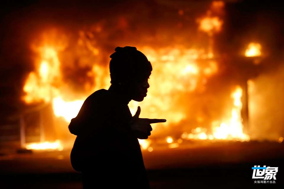 当地时间2014年11月24日,美国密苏里州弗格森,在圣路易斯陪审团决定对枪杀非裔青年布朗的警察威尔逊不予起诉后,当地爆发骚乱。图为一名男子从燃烧的大楼前走过。 CFP