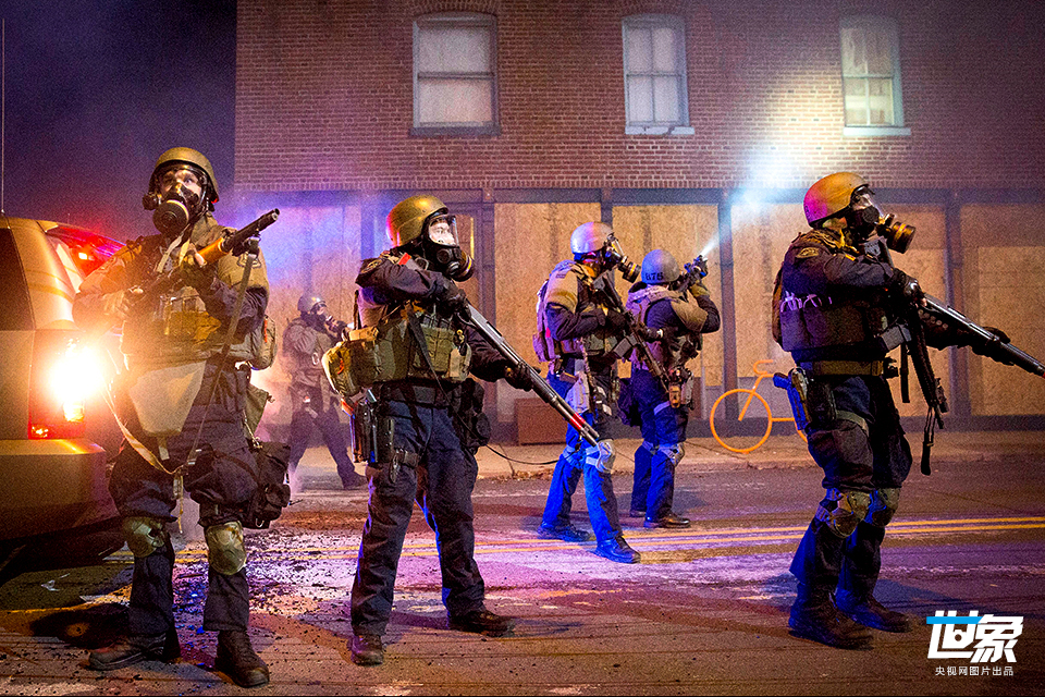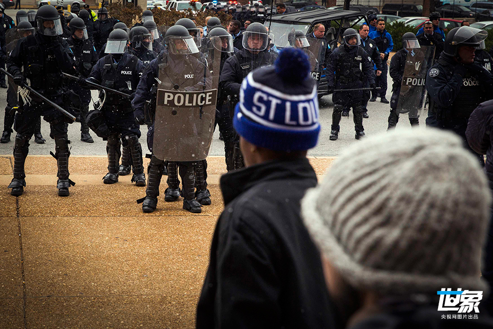 当地时间2014年11月24日,美国圣路易斯警方战术小队抵达West Florissant大道驱散示威人群。 St.Louis Post-Dispatch/Getty Images/CFP