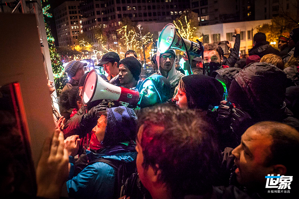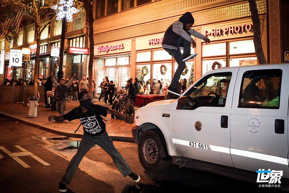 当地时间2014年11月28日,美国旧金山,示威者在“黑色星期五”到来之际,在购物繁忙地区进行抗议,部分示威者遭警方逮捕。 CFP