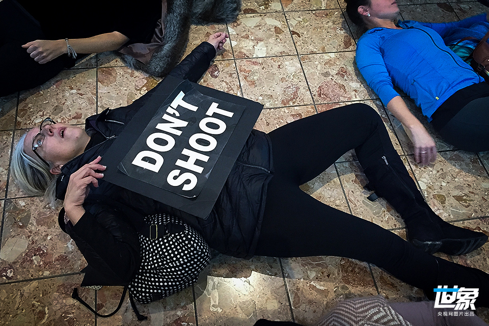 当地时间2014年11月28日,美国布伦特伍德,示威者高喊口号,“横尸”商场,在“黑色星期五”到来之际,抗议非裔青年布朗遭白人警察枪杀。示威商场随后被关闭。 Michael B. Thomas/CFP