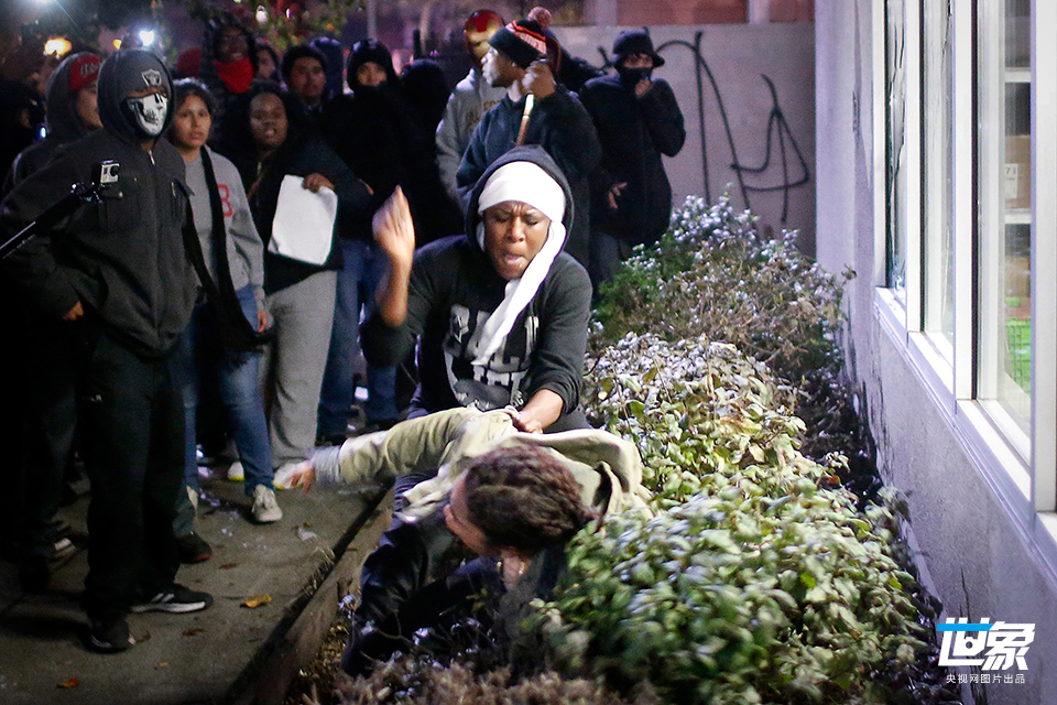 当地时间2014年11月26日,美国奥克兰,一名示威者阻止其他示威者,试图保护一家便利店。 CFP