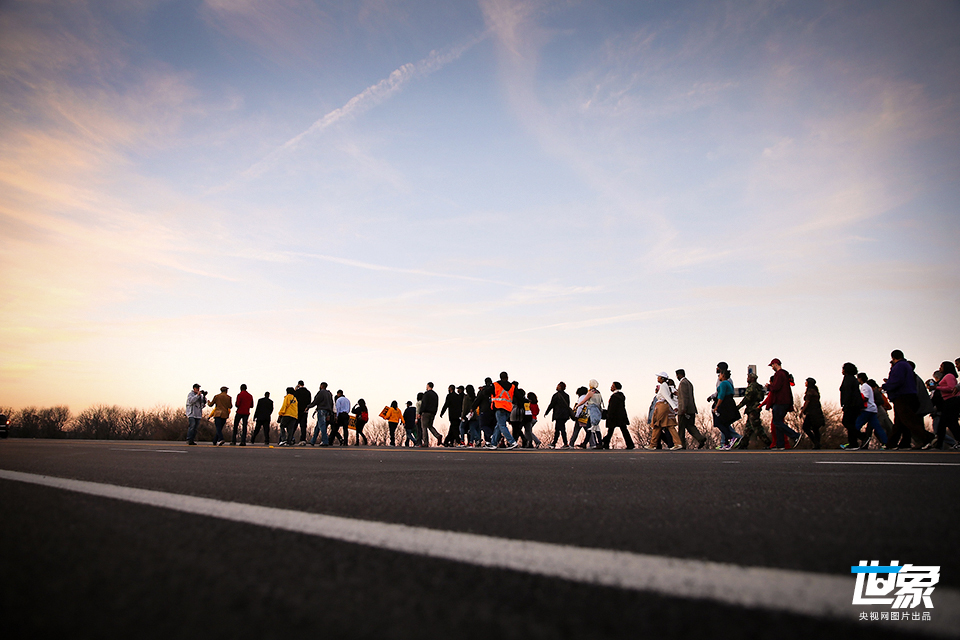 当地时间2014年11月29日,美国密苏里州弗格森,民众从弗格森出发开始游行,将历时7天,游行120英里(193千米),抵达杰佛逊市的密苏里州州长官邸,抗议18岁非裔青年布朗遭白人警察威尔逊枪杀。 Scott Olson/GettyNorthAmerica/CFP