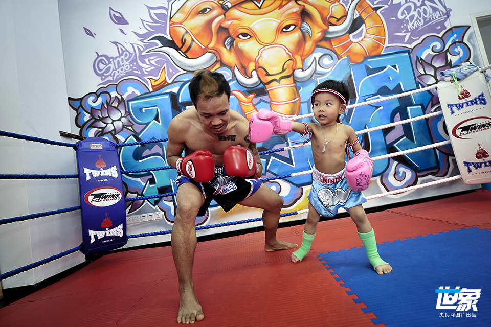 2014年4月25日,拳王奔胜正在拳馆教自己四岁的广州混血宝宝PPJ一起做泰拳比赛前的祈福表演,小拳王宝宝是奔胜的心头肉,所以每次只要有空他都会带上孩子,抽空教授古老的泰拳文化。出生在泰国清迈周边山村的奔胜,泰国名叫BOON,如今在广州天河经营一家泰拳馆。在广州生活的十多年时间里,奔胜学会了说一口较为流利的普通话,广州话是“识听,不识讲”,最为得意的是娶到了一个广州媳妇,有了一个四岁的小拳王。 CFP