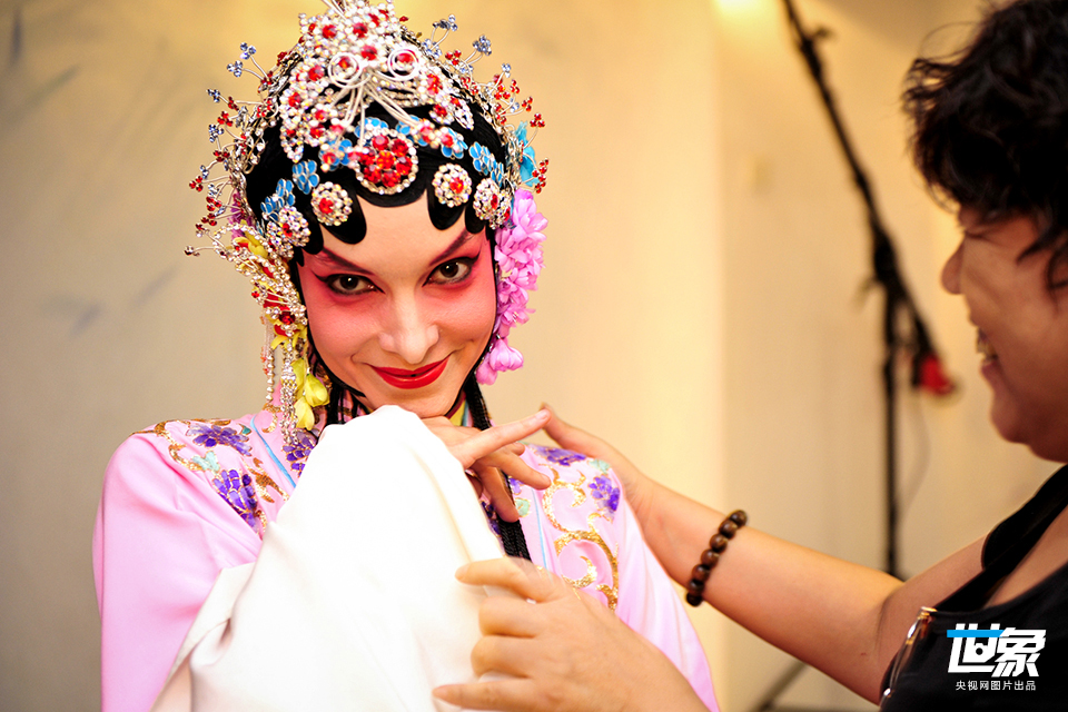 2010年9月17日,在西安学习中文的安琪对秦腔很痴迷,她的戏妆扮相妩媚迷人。安琪在英国留学时兼修了汉语,到了西安后,浓厚的传统文化氛围让她对秦腔、剪纸、捏泥人产生了浓厚的兴趣。她常常和同学一起去陕西省戏曲研究院的剧场听秦腔,秦腔里婉转的唱腔、优美的舞姿还有靓丽的戏装都让她痴迷。 陈团结/CFP