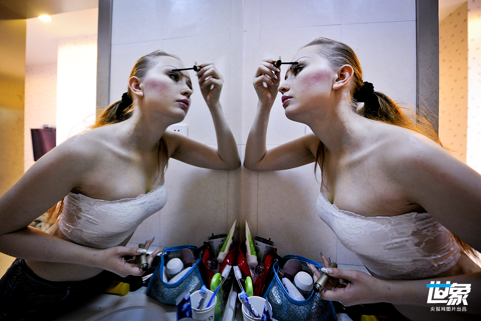 2013年12月5日,江苏扬州,丰胸手术后10天,23岁的吉尔吉斯坦女孩丽娅第一次化妆。丽娅是一位平面模特,2年前来到中国武汉,在模特行业里打拼。丰胸是丽娅很久以来的一个梦想,因为她要做一个“芭比公主”一样的模特。 程建平/CFP
