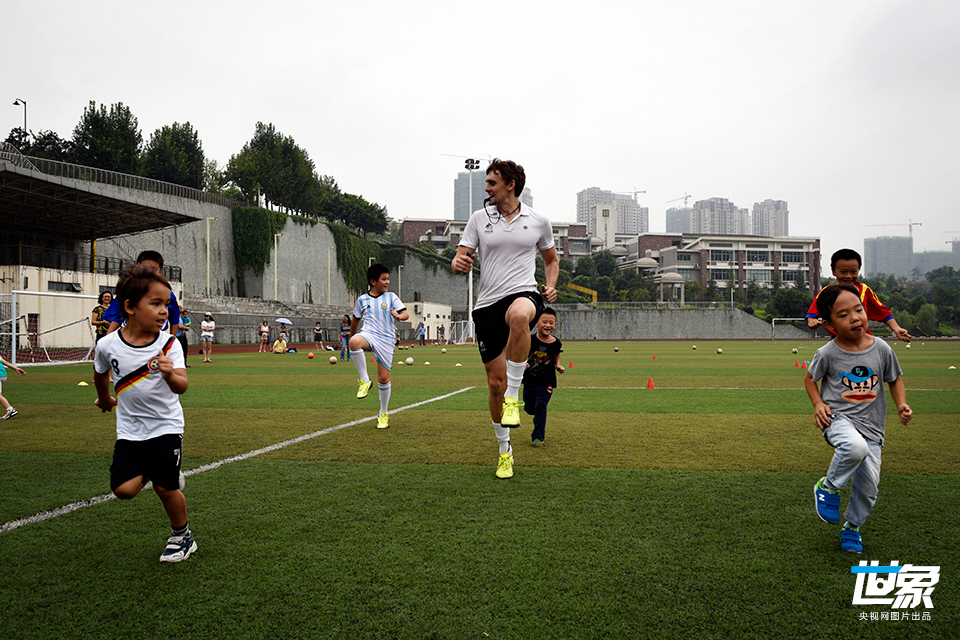 2014年9月7日,重庆。在渝北区某中学操场上,Evan带领孩子们快跑。Evan是足球学校的校长,也是主教练,更是重庆国际足球队队长。说起这些新的中国学生,Evan笑着说,中国孩子更腼腆一点,但是爱足球的心都是一样的,所以孩子们一旦放开了,都是全身心的投入。 CFP