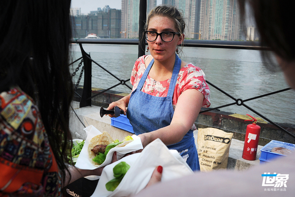 2012年5月5日,上海,黄浦江边的南外滩,英国姑娘“爱美丽”(Amelia)操着生硬的普通话和英语,在卖英式烤肠卷饼,“爱美丽”从英国大学毕业后,来上海的赛车公司做工程师,两年后离职,但她不愿离开上海,就和朋友一起开了家DIY果酱作坊,现在生意越做越好。 杨毅/CFP