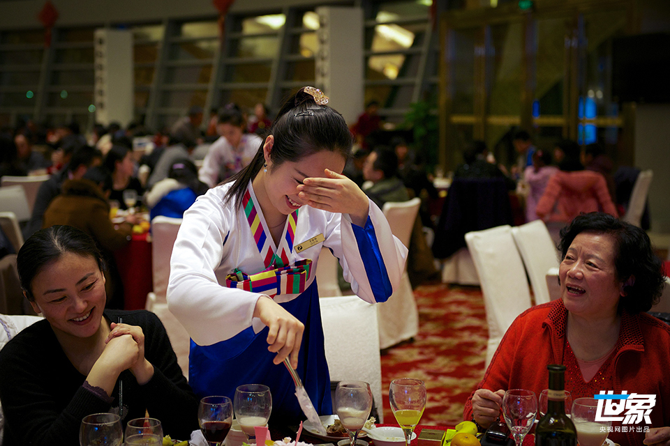 2013年2月11日,江苏江阴华西村,身着传统服装的朝鲜服务员在华西村龙希国际大酒店的中餐厅里为宾客服务。据报道,超过30名的朝鲜工作人员自2011年12月来到华西村工作,这些朝鲜工作人员大多数都来自高干家庭,并且在朝鲜接受了4年大学学习。 吴小伟/CFP
