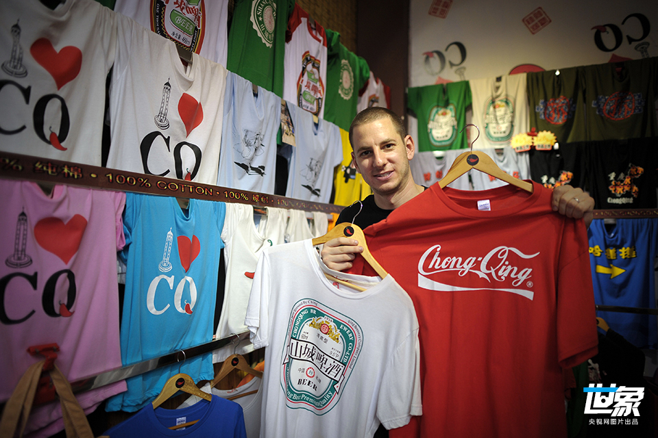 2014年7月15日,小店里,高峰用重庆元素装点自己设计的文化衫。高峰英文名叫Keith,是一名来自美国纽约的29岁小伙,也是个重庆女婿。高峰认为,重庆很像家乡纽约。“纽约是个岛,有江有桥有高楼,重庆也是岛上的城市,也有江河和桥,还有高楼。”高峰说:“来到这里,我觉得和在家乡一样comfort(舒服),就决定不走了。” CFP