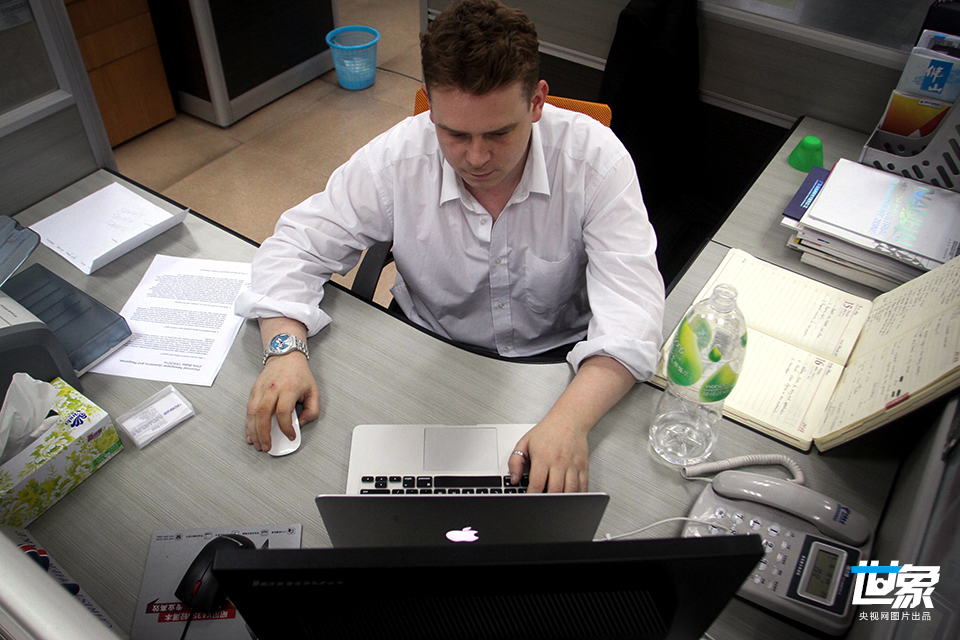 2014年5月16日,广东佛山,Chris盯着电脑,正在工作。来自英国的克里斯(Chris)是佛山市外经贸局年初招聘了四名外国雇员之一。佛山投资促进局副局长俞红平告诉记者,这次聘外国雇员,最大的感受就是发现很多外国人都看好中国,报名的人很多,竞争激烈,录取比例达18:1。 CFP