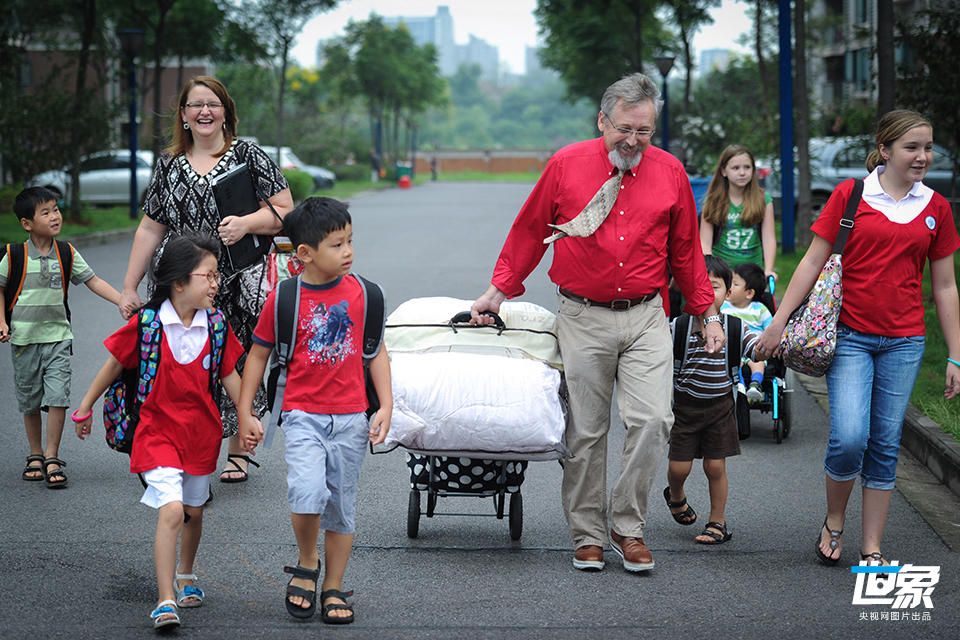 2012年9月2日,武汉,美国夫妇道格拉斯和阿曼达带着他们的九个孩子从家里出发去上学,一路歌声一路欢笑,成为了前往学校路途中的一道风景。夫妇俩都是武汉中芯学校外教老师,在武汉已工作生活了5年。他们有11个子女,其中有9个子女在武汉与他们一起生活,并就读同一所学校。而这9个子女中有6个是从福利院收养的。他们很享受孩子们带来的欢乐。 刘中灿/CFP