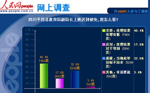 ¡¡¡¡ÈËÃñÍø±±¾©1ÔÂ9ÈÕµç 1ÔÂ4ÈÕ£¬±»ËÄ´¨Ê¡°ÍÖÐÊÐÈí½¨°ìµãÃûµÄµäÐͰ¸Àýƽ²ýÏØ½ÌÓý¾Ö»ú¹Ø¹¤×÷ÈËÔ±´óÃæ»ý³Ùµ½ÓÐÁË´¦Àí½á¹û£¬Æ½²ýÏØÎ¯ÒÑÓÚ2011Äê12ÔÂ31ÈÕÃâÈ¥¸Ã¾ÖÖ÷³Ö¹¤×÷µÄ¸±¾Ö³¤ÌÆÄ³Ö°Îñ¡£¾Ý´Ë£¬ÈËÃñÍø·¢²¼µ÷²é¡°ËÄ´¨Æ½²ýÏØ½ÌÓý¾Ö¸±¾Ö³¤Éϰà³Ùµ½±»Ãâ,ÄúÔõô¿´?¡±¡£