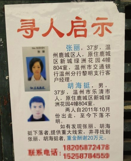 ¡¡¡¡¡¶Ñ°ÈËÆôʾ¡·ÏÔʾ£¬ÕÅÀö£¬37Ë꣬ÔÊǽ»ÐÐÎÂÖÝ·ÖÐÐÀèÃ÷Ö§Ðпͻ§¾Àí£»ÆäÕÉ·òºúº£Í¦Ò²ÊÇ37Ë꣬ÎÂÖÝÊÐÀÖÇåÊÐÈË¡£¸æÊ¾Ï·½Ôò¹«²¼ÁËÁ½¸öÁªÏµ·½Ê½¡£