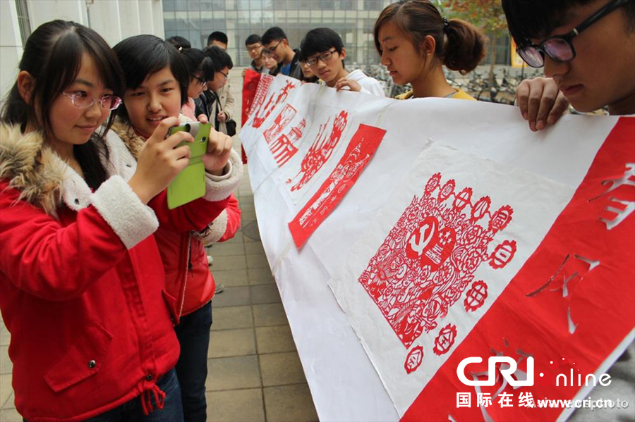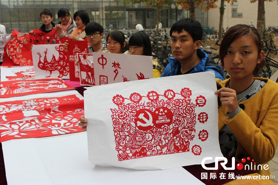在山东聊城大学,大学生志愿者们在展示创作的剪纸作品,以庆祝党的十八届三中全会的召开。