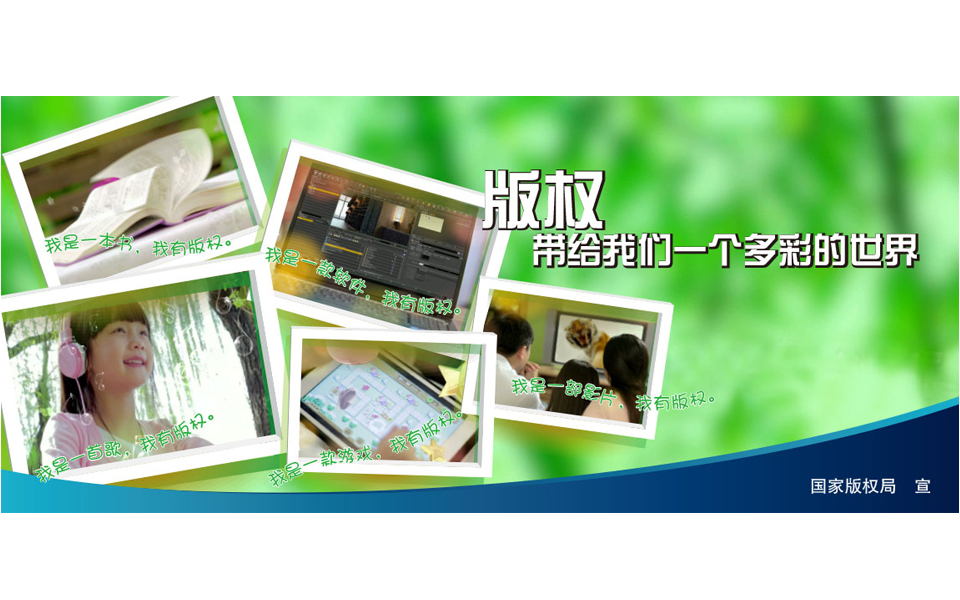 四、国家版权局将制作版权公益广告宣传片、宣传海报等素材,并将于4月上旬陆续上传到国家版权局官方网站(www.ncac.gov.cn)的宣传周专区。[详细]
