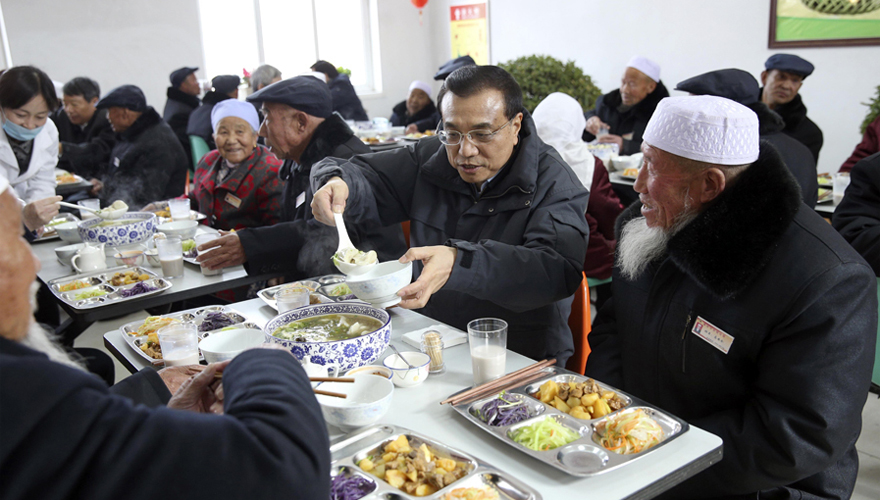 李克强1日来到宁夏固原市原州区中心敬老院,与老人们在一起过小年。总理与坐在身旁的回族老人马安仓边吃边拉家常,称赞老人“红光满面”,还给他盛了一碗热气腾腾的饺子。随后,李克强起身举起手中的热饮,祝愿各位老人身体健康,幸福长寿。