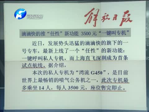 [中原晨报]解放日报 滴滴快的推“任性”新功能 3500元“一键叫专机”