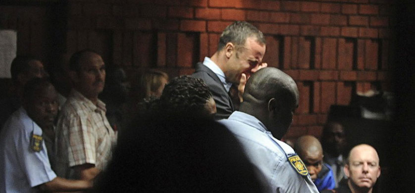 2月15日,南非残奥冠军、“刀锋战士”皮斯托瑞斯(中)泪洒法庭。 2月15日早上不到9点,皮斯托瑞斯在警方的押送下来到南非比勒陀利亚地区法院。[详细]