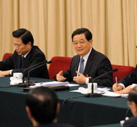 中共中央总书记、国家主席、中央军委主席胡锦涛今天出席十一届全国人大四次会议解放军代表团全体会议并发表重要讲话。中共中央政治局常委、国家副主席、中央军委副主席习近平出席会议。