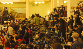 为了抢上一条新闻,众记者使出浑身解数,会场内外关于记者的“趣事”也是层出不穷。记者“方阵”的最后排,密密麻麻的摄影摄像记者组成一道人墙。原来采访也是一场拼体力、又得拼技术的活儿。由于来的记者太多,在记者招待会现场,两张椅子上挤了三个人的现象随处可见。纵然如此,会场的两旁,还站立着很多没有座位的记者。 [详细]