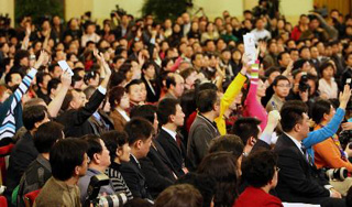 在记者招待会上向总理提问,尽管是很多记者一生难逢的机会,于是大家都想方设法怎么才能引起总理的注意,成功地获得提问的机会。2009年的总理记者招待会曾有报道称,现场的女记者们都是鲜艳打扮,一问才得知原来大家都互相传递了经验:围巾鲜艳一点容易被总理看到。由此可见,为了获得机会大家是绞尽脑汁。 [详细]