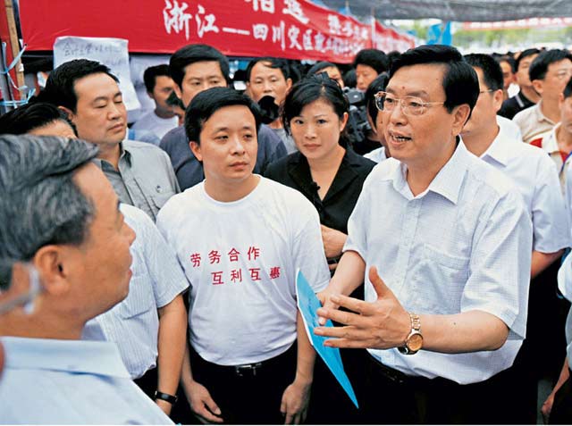 2008年6月29日,张德江在四川省都江堰市劳务输出专场招聘会现场了解对口支援省市就业援助情况。新华社记者张维革摄