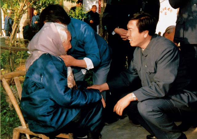 张德江在民政部工作期间,到河南农村敬老院调研时看望百岁老人。新华社发