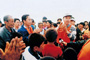 1998年8月20日,张德江乘冲锋舟到吉林省镇赉县嘎什根乡看望被洪水围困的群众,指导抗洪救灾工作。新华社发(上图左1) 1998年10月24日,张德江在浙江民营企业调研。新华社发(上图左2)