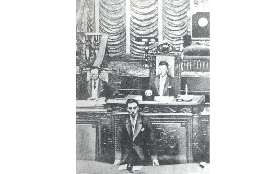 图为:1937年7月27日,日本首相在第七十一次会议上发表鼓吹侵华战争演讲。