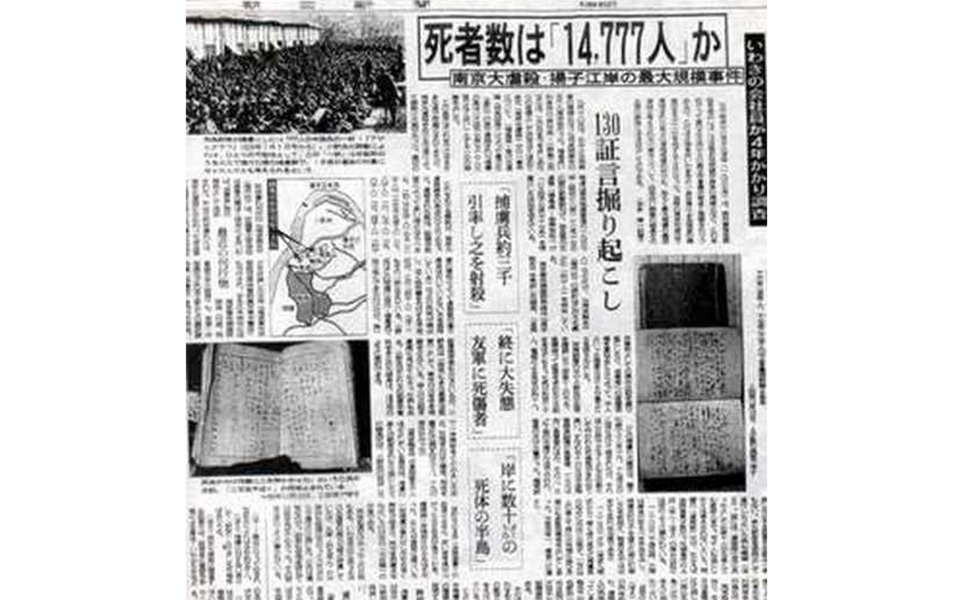 图为:日本《朝日新闻》刊载的报道,日军攻陷南京后在长江边大批屠杀中国俘虏。