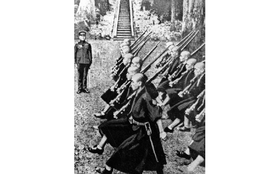 图为:日本开展大规模战争前对越前永平寺僧人也进行军事训练。