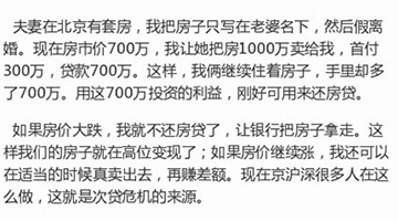 2016-03-04 09:54:28最近,社交媒体上疯传一线城市炒房的 “终极模式”,通过这种方法,炒房者可以通过已有房产套取银行资金,套取的资金可以拿去继续炒房;同时,这样操作风险完全丢给了银行,炒房者不担任何风险。好像一时间大家都找到了炒房的“终极秘籍”,但事实真像这道题一样美好吗?[详细]