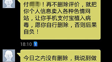 2016-05-26 09:26:12女大学生小付,4月15日,她在淘宝网上花费50元,购买了一件女式短袖。收到货后,感觉衣服质量很差,就给了店家一个差评。没想到的是,店家竟发来威胁短信,称如果不删除,就将其个人信息卖入色情网站。[详细]