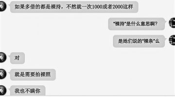 2016-06-17 08:50:59近日,有网友曝光称,通过网络借贷平台借贷宝,有女大学生被要求“裸持”进行借款,逾期无法还款将被威胁公布裸照给家人朋友,且借款周利息高达30%。在一些借款群中,女大学生“裸持”借款已经成为公开的秘密,通过“裸持”可以借款的金额是普通借款额度的2至5倍,但逾期未还将面临裸照被公布的威胁,甚至有借款人威胁“裸持”借款的女生提供性服务。[详细]