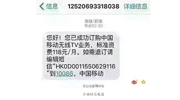 2016-03-26 07:54:31诈骗短信又出现了新的方式。近期,警方接多名市民反映,收到内容为“您已成功订购中国移动无线TV业务,标准资费118元/月。如需退订请编辑短信‘HK0D0011550629116’到10086。中国移动”的短信。市民若按短信提示申请退订,自己的手机号便会被骗子复制。[详细]