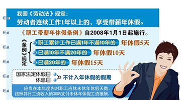 2015-08-04 10:33:30规定:《意见》对带薪年休假制度提出,强化全社会依法休假理念,将带薪年休假制度落实情况纳入各地政府议事日程,作为劳动监察和职工权益保障的重要内容,推动机关、企事业单位加快落实职工带薪年休假制度。鼓励职工结合个人需要和工作实际分段灵活安排带薪年休假。甚至“高等学校可结合实际调整寒、暑假时间,中小学可按有关规定安排放春假,为职工落实带薪年休假创造条件”。[详细]