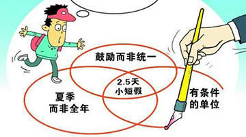 2015-08-08 05:53:57近期召开的国务院常务会议提出“推动各地落实带薪休假制度”。记者注意到,今年以来,中国官方至少已五次公开强调落实带薪休假,一些地方也出台了相关细则,带薪休假的落实力度正不断加大。根据官方释放的政策信号,未来将鼓励有条件的地方和单位,可根据实际情况,在夏季灵活安排工作时间,使职工周五下午与周末时间相结合,实现小短假。[详细]