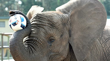 2016-06-20 08:18:192016年法国欧洲杯近日开赛,欧洲各路强队激战正酣。继章鱼保罗之后,各种动物“神算子”纷纷出道预测比赛结果,成为人们在赛前津津乐道的话题。据报道,在首轮德国和乌克兰的比赛之前,德国霍登哈根野生动物园的一头大象将足球踢进了乌克兰队的大门,预言德国获胜。[详细]