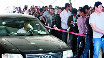 2015-03-21 06:13:45昨日上午,中央和国家机关公车改革取消车辆的第二批首场拍卖开槌,截至昨日下午1时30分许,100辆参与竞拍的公车全部拍出,相对于总起拍价360.2万元的价格,最终的成交价达到902.7万元,溢价率高达150.6%,创出公车拍卖以来的新高。竞拍现场,伴随着大户们豪放地举牌竞价引起现场阵阵欢呼和掌声的背后,还有不少原本打算低价捡漏的竞拍者咋舌“有钱任性”的无奈感叹。[详细]