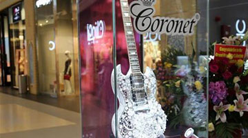 2016-05-28 08:37:185月22日,得到吉尼斯世界纪录认证的全球“最昂贵吉他”在阿联酋迪拜一个购物中心展出。拥有吉尼斯世界纪录“最昂贵吉他”称号的冠玲珑钻石吉他,22日在阿联酋迪拜一家珠宝连锁店的新店开幕活动上亮相。这件钻石吉他由中国香港著名音乐人雷颂德设计,周大福珠宝公司与吉布森吉他公司合作出品,用400克拉钻石和1.6公斤黄金镶嵌打造而成,总价值达200万美元(约合1300万元人民币)。[详细]
