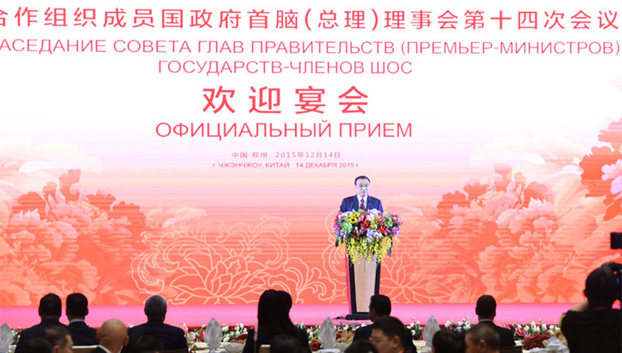 12月14日,国务院总理李克强在河南郑州为来华出席上海合作组织成员国政府首脑(总理)理事会第十四次会议的各国领导人举行欢迎宴会。这是李克强在欢迎宴会上致辞。