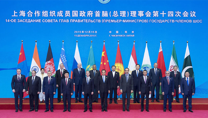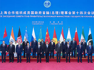 15日上午,李克强总理在郑州国际会展中心与出席上海合作组织成员国政府首脑(总理)理事会第14次会议的成员国、观察员国领导人和国际组织负责人集体合影。