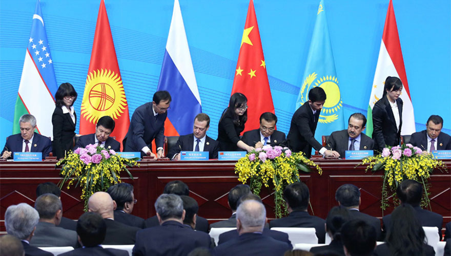 12月15日,国务院总理李克强在郑州国际会展中心主持上海合作组织成员国总理第十四次会议。这是会后,上合组织成员国领导人出席签字仪式。