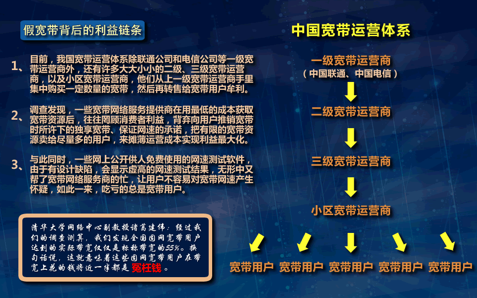 记者跟随清华大学的网络技术专家先后在北京、四川、天津、深圳、河北、山东等地,对英联宽带、中宽网、同创宽带等网络服务商提供给用户的宽带进行测试调查后发现,像这种宽带带宽缺斤短两、网速严重偏慢的现象绝非个别。诸葛建伟:经过我们的调查测算,我们发现全国固网宽带用户达到的实际带宽仅仅是标称带宽的55%。换句话说,这就意味着这些固网宽带用户在带宽上花的钱将近一半都是冤枉钱。