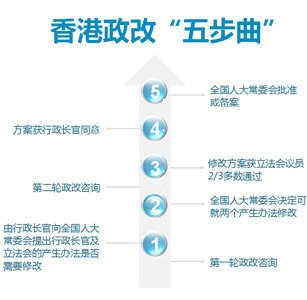 根据基本法及全国人大常委会2004年的解释,要修改香港特区行政长官和立法会的产生办法,必须依法完成“五步曲”的程序。 2014年8月31日,第十二届全国人民代表大会常务委员会第十次会议通过了关于香港特别行政区行政长官普选问题和2016年立法会产生办法的决定。