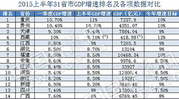 2015-08-13 19:12:29随着上半年全国经济运行数据的发布,各省市也陆续发布了2015年上半年GDP的“成绩单”。目前已有27个省份公布了2015年上半年本省份GDP数据。GDP增速名列前三的是重庆、贵州、天津,这3个省市的GDP增速分别为11%、10.7%、9.4%。在前3名的省份当中,西部省份占据了2个席位。[详细]