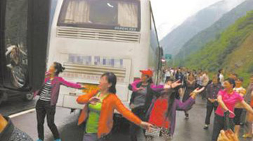 2014-06-18 06:10:276月6日上午,网友“27岁的双鱼座微笑兲使洁”在微博上就发布了3张图片,显示5名大妈在堵车的都汶高速上跳起了广场舞,不少人围观。[详细]