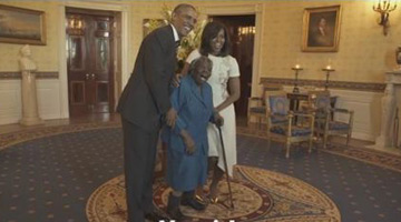 2016-04-23 05:47:11台媒称,106岁的非裔老人麦克劳林(Virginia McLaurin)一生看到18位美国总统轮替,但这位百岁人瑞在见到奥巴马夫妇一面后,才终于实现一辈子的梦想。根据白宫上传的视频,参观白宫的麦克劳林老太太见到奥巴马和第一夫人米歇尔时,手脚灵活的她挥舞手杖雀跃不已。[详细]