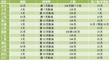 2016-06-02 09:19:59日前,黑龙江通过了新修改的《黑龙江省人口与计划生育条例》。伴随着这一条例出炉,全国已有至少27个省份修改了本地区计生条例。各地均对原有的婚假、产假及护理假等做出了调整,多数省份婚假都有所增加,而黑龙江则专门为参加婚前医学检查的夫妻增加婚假10日。[详细]