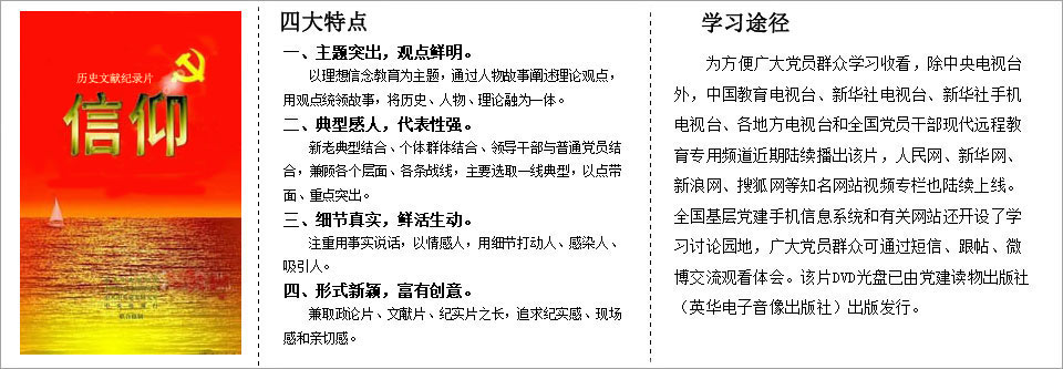 按照中组部的要求,我们电视台做了精心的安排,调整了其他的节目,6月25日到27日,在教育电视台一频道晚间黄金时段播放了这部片子。据我们统计,在同期同类的节目中,它是收视率最高的。下一步我们将按照中组部和教育部的要求,不仅在干部职工当中开展坚定信仰教育,我们还将继续播放这部电视片,让更多人正确选择信仰,始终坚守信仰,努力实践信仰。[详细]